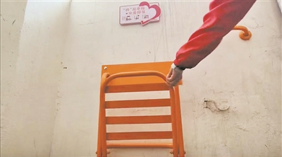 4月21日,记者在建国社区一栋居民楼里看到了这把椅子:可折叠,够结实,旁边还有个扶手,稳稳地安在“二楼半”的墙上。
