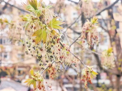 复叶槭开花似流苏轻柔。 本报讯(冯雨皙 闫明莹 记者 王铁军)当榆叶梅的粉霞还在枝头烂漫,哈尔滨的街头和校园里,另一种低调的春景已悄然上线——复叶槭的花,正垂挂在枝间,如一串串轻柔流苏,为冰城春季添上一抹清新雅致的底色。